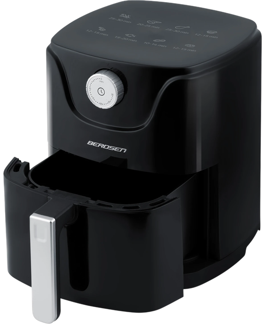 Berdsen BD‑654 Black to kompaktowy multicooker, który pozwala na smażenie ulubionych potraw z minimalną ilością tłuszczu, zachowując ich smak, chrupkość i soczystość. Dzięki technologii cyrkulacji gorącego powietrza zapewnia złocistą skórkę na zewnątrz i delikatną konsystencję w środku, dzięki czemu potrawy są o 90% mniej tłuste w porównaniu z tradycyjnym smażeniem. Pojemność misy 2.5 l i 8 automatycznych programów pozwalają na szybkie smażenie frytek, kurczaka, warzyw i innych lekkich i zdrowych potraw bez bałaganu i nieprzyjemnych zapachów. Model wyposażony jest w energooszczędną grzałkę o mocy 1000 W, termoizolacyjną obudowę i funkcję automatycznego wyłączania po upływie maksymalnego czasu pracy. Dzięki kompaktowym wymiarom — 31 cm głębokości z uchwytem, 21.5 cm szerokości, 25 cm wysokości — multicooker z łatwością zmieści się w każdej kuchni, co czyni go praktycznym rozwiązaniem do codziennego, zdrowego gotowania.