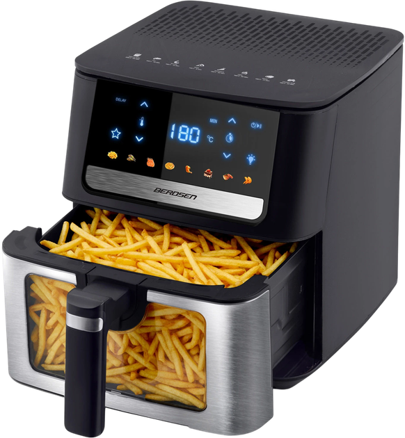 Frytkownica beztłuszczowa Berdsen BD‑655 Black to nowoczesna frytkownica powietrzna o dużej pojemności 6.5 litra, która pozwala przygotowywać zdrowsze dania z minimalną ilością tłuszczu dla całej rodziny. Moc 1700 W zapewnia szybkie i równomierne gotowanie, a 8 automatycznych programów i ekran dotykowy sprawiają, że obsługa jest intuicyjna i wygodna. Kosz z okienkiem i podświetleniem LED pozwala monitorować proces bez otwierania, a funkcje opóźnionego startu i przypomnienia o konieczności przewrócenia potrawy zwiększają komfort codziennego użytkowania. Model wyposażony jest w termoizolacyjną obudowę, elementy ze stali nierdzewnej, zabezpieczenie przed przegrzaniem, automatyczne wyłączanie i uchwyt nienagrzewający się do zimna. Dzięki zakresowi czasu od 1 do 60 minut, wyjmowanemu uchwytowi, rusztowi pokrytemu PTFE oraz możliwości gotowania bez papieru do pieczenia, Berdsen BD-655 staje się wszechstronnym i praktycznym pomocnikiem kuchennym, łączącym bezpieczeństwo, moc i wygodę.