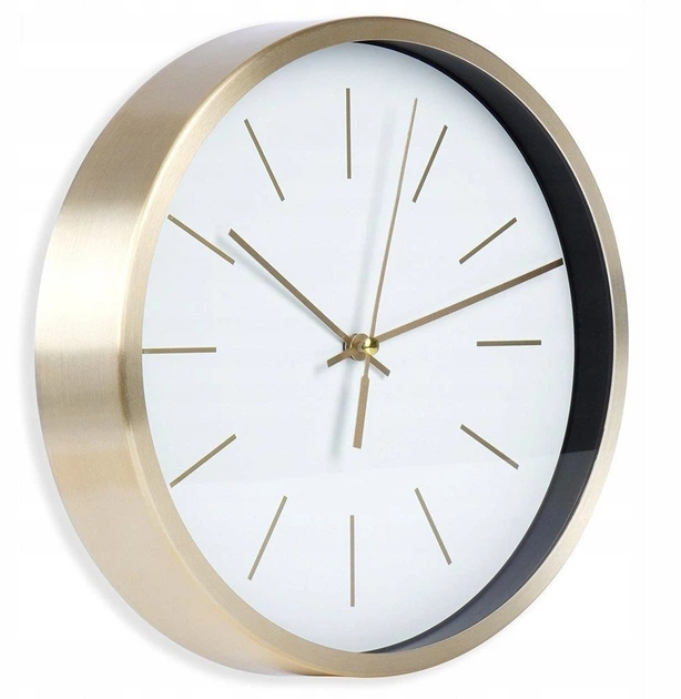 Efektowny - Tarcza zegara jest w kolorze białym, a wskazówki i kreski oznaczające godzinę są w kolorze złotem.