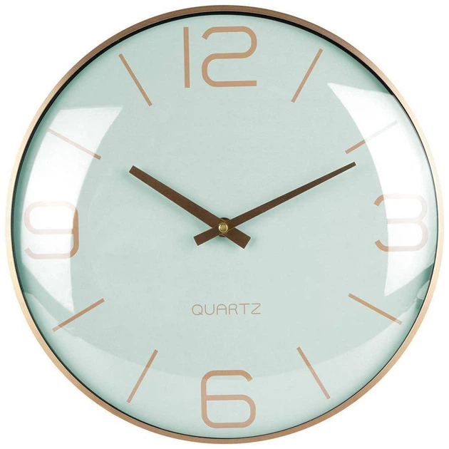 Efektowny - Tarcza zegara z dużymi cyframi oraz wskazówkami w kolorze złotym. Tarcza zegara jest w kolorze miętowym, dzięki czemu zegar jest bardzo efektowny - zarówno liczby jak i wskazówki są wyraźne.