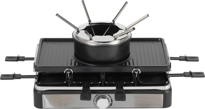 Grill do raclette i zestaw do fondue Salter to uniwersalne urzadzenie imprezowe, ktore laczy w sobie wiele funkcji wspolnego biesiadowania. Urzadzenie dysponuje imponujaca moca 1400 W, co zapewnia szybkie i rownomierne nagrzewanie powierzchni. Wyposazenie obejmuje osiem patelni do raclette, drewniane lopatki oraz szesc widelczykow, a garnek do fondue o pojemnosci 1.3 l jest idealny do roztopionego sera, czekolady lub bulionu.