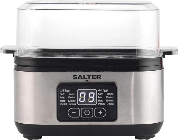 Cyfrowy gotownik do jajek Salter 3-w-1 to uniwersalne urzadzenie, ktore upraszcza przygotowywanie jajek na miekko, twardo, w koszulkach lub omletow. Model pozwala na jednoczesne gotowanie do 6 jaj, co czyni go idealnym wyborem na szybkie sniadanie rodzinne. Glowna zaleta jest cyfrowy wyswietlacz LED z funkcja odliczania czasu, ktory pozwala na precyzyjna kontrole procesu gotowania w celu osiagniecia idealnego rezultatu.