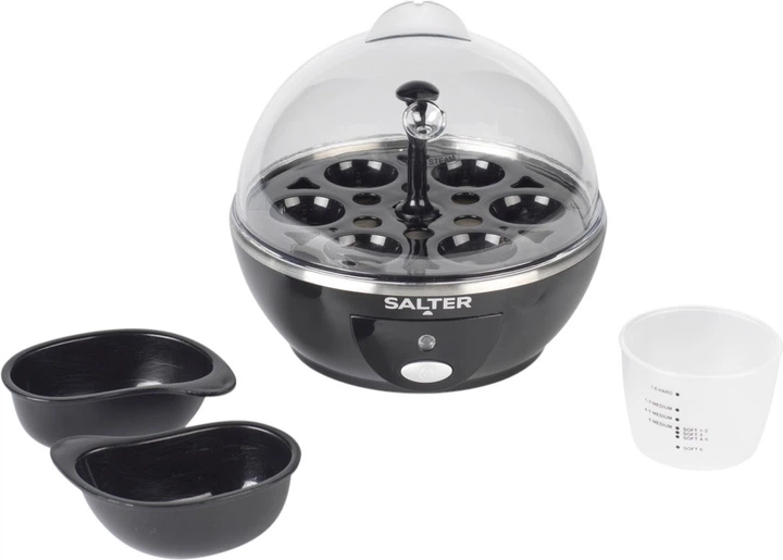 Elektryczny gotownik do jajek Salter o mocy 430 W to uniwersalne urzadzenie kuchenne zaprojektowane do szybkiego i zautomatyzowanego przygotowywania do 6 jaj jednoczesnie. Model pozwala z latwoscia uzyskac jajka o pozadanym stopniu twardosci: od miekkich po ugotowane na twardo, a takze zawiera dwie specjalne tacki do jajek w koszulkach. Dzieki przezroczystej pokrywie oraz wskaznikowi gotowosci proces gotowania staje sie maksymalnie prosty i kontrolowany.