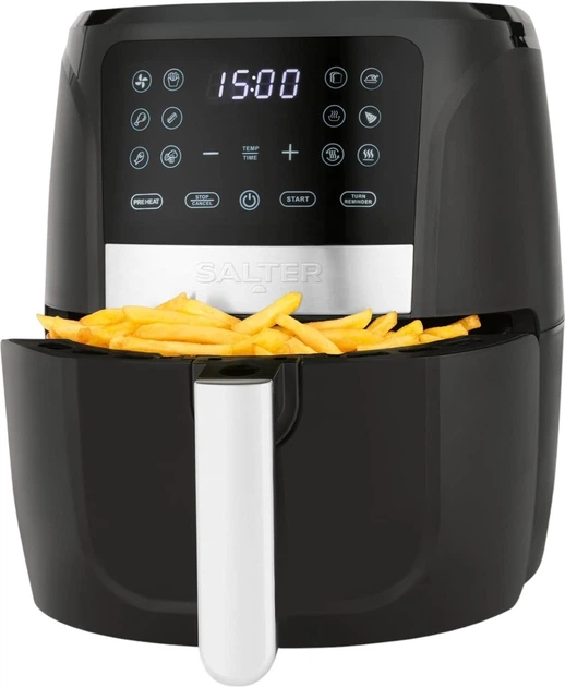 Frytkownica beztluszczowa Salter to wielofunkcyjne urzadzenie kuchenne oferujace 12 funkcji gotowania, w tym smazenie na powietrzu, pieczenie oraz podgrzewanie. Glowna cecha jest technologia cyrkulacji goracego powietrza, ktora pozwala na przygotowywanie ulubionych potraw z minimalna iloscia oleju lub calkowicie bez niego. Urzadzenie zostalo wyposazone w nowoczesny cyfrowy wyswietlacz LED z ekranem dotykowym, co zapewnia latwe i szybkie przelaczanie miedzy trybami pracy.