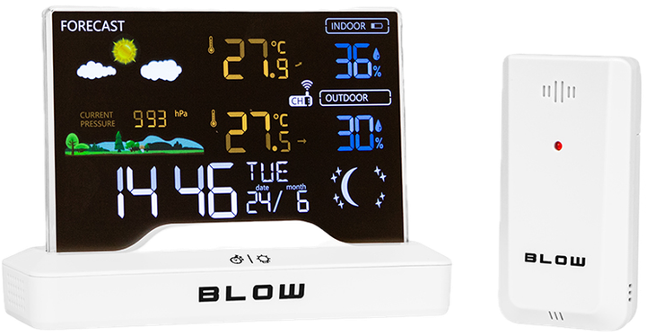 Oprócz podstawowych funkcji stacja BLOW WS104 oferuje barometr, prognozę pogody oraz funkcję alarmu. Informacje o aktualnym ciśnieniu atmosferycznym pozwalają na lepsze planowanie działań na świeżym powietrzu. Wbudowana pamięć zapisuje maksymalne i minimalne wartości temperatury i wilgotności, co umożliwia monitorowanie zmian w czasie. Funkcja zegara z formatem 12/24h i wyświetlaniem dnia tygodnia czyni to urządzenie uniwersalnym dodatkiem do każdego domu.