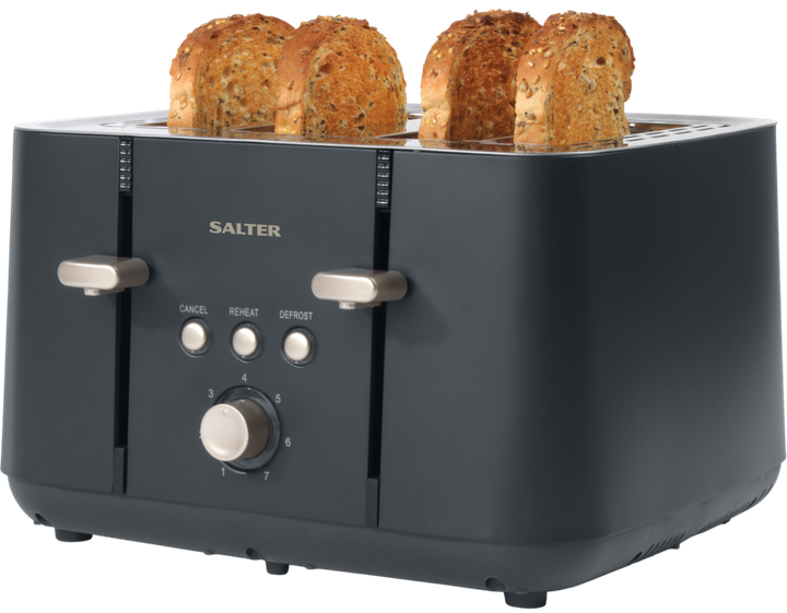 Toster SALTER EK5565BGRYFVDE z kolekcji Marino to stylowe i praktyczne rozwiązanie na codzienne śniadanie. Dzięki czterem szerokim komorom z łatwością opieka tosty, bajgle, crumpety i inne wypieki, zapewniając równomierny efekt dzięki samocentrującym prowadnicom. Model wyposażony jest w 7 poziomów opiekania, dzięki czemu każdy może wybrać idealny stopień chrupkości. Funkcja zapobiegająca zakleszczeniu zapewnia bezpieczeństwo i wygodę użytkowania. Przyciski rozmrażania, podgrzewania i anulowania pozwalają szybko poradzić sobie z każdą sytuacją – niezależnie od tego, czy chodzi o mrożony chleb, czy ostudzony tost. Wyjmowana tacka na okruchy pomaga utrzymać kuchnię w czystości, a stylowa, niebiesko-szara obudowa dodaje wnętrzu elegancji. Toster idealnie komponuje się z innymi urządzeniami z linii Marino, tworząc harmonijny i nowoczesny wygląd blatu kuchennego. To wszechstronne, niezawodne i piękne urządzenie, które sprawia, że poranne rytuały stają się jeszcze przyjemniejsze.