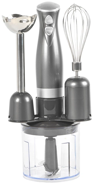Blender SALTER EK2827GUNMETALFVDE to wszechstronny zestaw 3 w 1 o mocy 350 W, który łączy funkcje siekania, miksowania i ubijania. Wyposażony jest w dwie prędkości i wytrzymałe ostrza ze stali nierdzewnej, które zapewniają szybkie i równomierne rozdrabnianie składników. Zestaw zawiera miskę rozdrabniającą o pojemności 500 ml, trzepaczkę i nasadkę blendera, dzięki czemu urządzenie jest wygodne do przygotowywania koktajli, sosów, kremów, zup, przecierów i ciasta. Kompaktowa konstrukcja i wyjmowane części ułatwiają przechowywanie i czyszczenie, a stylowy, metaliczny klosz dodaje kuchni nowoczesnego akcentu.
