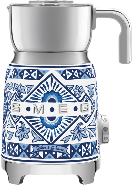 Spieniacz do mleka Smeg MFF01DGBEU z kolekcji Blu Mediterraneo, stworzony we współpracy SMEG i Dolce&Gabbana, łączy elegancki niebiesko-biały design inspirowany wybrzeżem Amalfi z szeroką gamą funkcji umożliwiających przygotowanie idealnej pianki mlecznej. Urządzenie działa w oparciu o technologię indukcyjną z automatycznym wyłączaniem, oferując tryby przygotowania ciepłego i zimnego mleka, delikatnej lub gęstej pianki, gorącej czekolady oraz programy manualne z precyzyjną regulacją. Antypoślizgowa podstawa zapewnia stabilność, a wyjmowany dzbanek ze stali nierdzewnej można myć w zmywarce, co znacznie ułatwia konserwację. Dzbanek ma pojemność 600 ml do podgrzewania i 250 ml do spieniania, co pozwala na przygotowanie kilku porcji napoju jednocześnie. Urządzenie ma moc 500 W, przewód o długości 1 metra, a w zestawie znajdują się dysze do podgrzewania i spieniania mleka lub robienia czekolady.