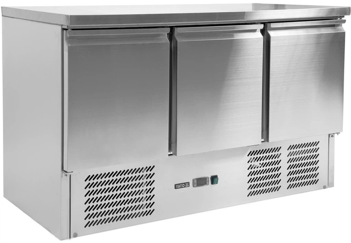 Stół chłodniczy YATO YG‑05300 to profesjonalny, trzydrzwiowy stół chłodniczy z powierzchnią roboczą, przeznaczony do intensywnego użytkowania w kuchniach restauracji, barów, kawiarni i hal produkcyjnych. Model wykonany jest ze stali nierdzewnej, co zapewnia wysoką wytrzymałość, odporność na korozję i łatwość utrzymania higieny podczas eksploatacji. Pojemność komory wewnętrznej wynosi 368 l, co pozwala na przechowywanie znacznej ilości składników, a zakres temperatur od +2°C do +8°C gwarantuje optymalne warunki do krótkotrwałego przechowywania świeżych produktów. System równomiernej cyrkulacji zimnego powietrza utrzymuje stabilną temperaturę nawet przy częstym otwieraniu drzwi. Troje drzwi zapewnia wygodny dostęp do produktów, a półki wewnętrzne są dostosowane do standardu GN. Stół wyróżnia się energooszczędnością, niezawodnością i stabilną pracą, co czyni go praktycznym rozwiązaniem dla profesjonalnych lokali gastronomicznych.