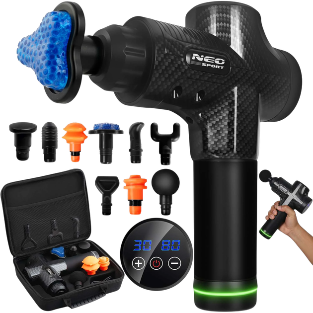 Masażer Neo Sport NS-503 to wydajny i wygodny pistolet do masażu ciała, który rozluźnia mięśnie, łagodzi napięcie i przyspiesza regenerację po treningu. Wyposażony jest w 30 poziomów intensywności, co pozwala na precyzyjną regulację siły masażu – od lekkiego relaksu po głęboką terapię mięśni. Ergonomiczna konstrukcja zapewnia wygodne trzymanie, a wbudowane zabezpieczenie przed przegrzaniem i zgodność z normami europejskimi gwarantują bezpieczeństwo użytkowania. Zestaw zawiera 9 wymiennych nakładek, odpowiednich do różnych grup mięśni: od dużych powierzchni po akupresurę i obszary wokół kręgosłupa. Urządzenie jest zasilane bateryjnie, co czyni je w pełni przenośnym, a ładowanie przez USB typu C zapewnia wygodę w każdych warunkach. Dzięki mocy 30 W, kompaktowej konstrukcji i szerokiej funkcjonalności, NS-503 stanie się uniwersalnym narzędziem do pielęgnacji domowej, treningu i podróży.