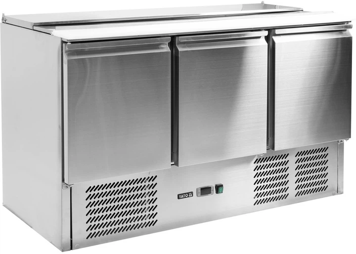 Stół chłodniczy YATO YG‑05290 to profesjonalny, 3-drzwiowy stół chłodniczy do sałatek z pokrywą, zaprojektowany z myślą o wygodnym przechowywaniu składników i organizacji pracy podczas przygotowywania sałatek, dań na zimno i dodatków. Dzięki pojemności 368 l i zakresowi temperatur pracy od +2 do +8°C idealnie nadaje się do kuchni restauracji, barów, pizzerii i innych lokali gastronomicznych. Korpus wewnątrz i na zewnątrz wykonany jest ze stali nierdzewnej SS201, co zapewnia trwałość, higienę i łatwość czyszczenia. Górna pokrywa, również uchylna, również wykonana ze stali nierdzewnej, chroni składniki i utrzymuje optymalne warunki przechowywania. Powierzchnia robocza wykonana jest z polietylenu, odpornego na uszkodzenia mechaniczne i wygodnego do krojenia i przygotowywania produktów. Agregat chłodniczy o mocy 240 W, umieszczony poniżej, pracuje na ekologicznym czynniku chłodniczym R290a i odpowiada 4 klasie klimatycznej (do 30°C i 55% wilgotności). Elektroniczny sterownik z cyfrowym wyświetlaczem pozwala na precyzyjną regulację temperatury. Wymuszone chłodzenie z wentylatorem i automatyczne rozmrażanie zapewniają stabilną pracę i równomierne rozprowadzanie zimna. Trzy samozamykające się drzwi wyposażone są w wygodne uchwyty. Wewnątrz każdej sekcji znajduje się kratka pokryta PVC, o udźwigu do 40 kg, kompatybilna z pojemnikami GN 1/1. Dodatkowo stół posiada otwór górny, który pomieści 4 pojemniki GN 1/1 o głębokości do 150 mm, co pozwala na wygodne układanie składników do sałatek i dań na zimno. (Pojemniki nie są dołączone do zestawu). To niezawodne, pojemne i funkcjonalne rozwiązanie dla profesjonalnych kuchni, gdzie liczy się szybkość pracy, higiena i łatwy dostęp do składników.