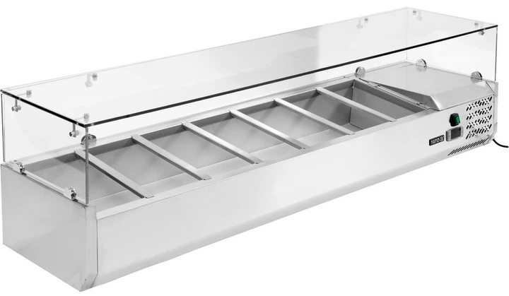Witryna chłodnicza YATO YG‑05331 to witryna stołowa przeznaczona do przechowywania 7 pojemników GN 1/3 GN, która pozwala na wygodne przechowywanie produktów w profesjonalnej kuchni. Pracuje w zakresie temperatur od +2 do +8°C, zapewniając stabilne chłodzenie produktów przez cały dzień pracy. Korpus wykonany jest ze stali nierdzewnej i szkła hartowanego, co gwarantuje trwałość i higienę w codziennym użytkowaniu. Model ma wymiary 1600 × 395 × 435 mm, dzięki czemu jest łatwy w montażu na blacie roboczym i nie zajmuje dodatkowej przestrzeni. To praktyczne rozwiązanie dla pizzerii, barów sałatkowych i barów szybkiej obsługi, gdzie ważna jest organizacja przechowywania produktów i stabilna temperatura.