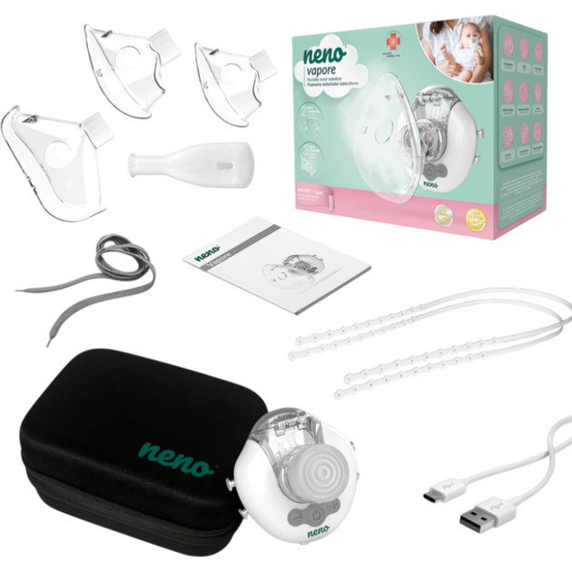 Przenośny nebulizator siateczkowy Neno Vapore to nowoczesny, cichy i wygodny inhalator przeznaczony do skutecznej terapii oddechowej w każdych warunkach. Dzięki wyjątkowo cichej pracy nadaje się nawet do nocnych inhalacji, nie przeszkadzając innym członkom rodziny. Urządzenie oferuje trzy prędkości podawania mgiełki, co pozwala dostosować inhalację do potrzeb użytkownika i zmaksymalizować potencjał terapeutyczny leku. Jest to wyrób medyczny - należy stosować zgodnie z instrukcją lub etykietą. Neno Vapore generuje cząsteczki o wielkości MMAD < 5 mikronów, co zapewnia głęboką penetrację leku do dolnych dróg oddechowych. Wysoka frakcja respirabilna wynosząca 65% sprawia, że inhalacje są maksymalnie skuteczne. Urządzenie obsługuje dwa tryby użytkowania - przez maskę lub ustnik - co pozwala wybrać najwygodniejszą metodę terapii. Zestaw zawiera trzy maski o różnych rozmiarach (dla noworodków, dzieci i dorosłych), ustnik, uchwyty do maski oraz kabel USB. Dzięki temu nebulizator jest odpowiedni dla użytkowników w każdym wieku. Pojemnik na lek o pojemności 6 ml zapewnia długotrwały spray bez konieczności częstego uzupełniania. Kompaktowy, lekki i przenośny Neno Vapore idealnie nadaje się w podróży. W zestawie znajduje się praktyczne etui do bezpiecznego przechowywania i transportu. Prosta obsługa i minimalna liczba części sprawiają, że urządzenie jest intuicyjne i wygodne w codziennym użytkowaniu – zarówno w domu, jak i w podróży.