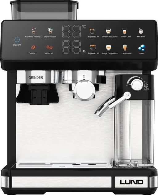 Ekspres ciśnieniowy z młynkiem żarnowym i spieniaczem Lund 68501 to połączenie nowoczesnego, stalowego designu z funkcjonalnością. Oferuje 11 automatycznych programów, umożliwiając przygotowanie zarówno klasycznego espresso, jak i mlecznych specjałów – szybko, wygodnie i zawsze z powtarzalnym efektem. Kolorowy, dotykowy panel sterowania sprawia, że wybór napoju i obsługa urządzenia są szybkie i intuicyjne, a system Thermoblock i pompa 20 bar gwarantują stabilną ekstrakcję i szybką gotowość do pracy. Dodatkowo ekspres wyposażono w automatyczny program czyszczenia i duże, łatwe do mycia zbiorniki na wodę i mleko, co upraszcza codzienną obsługę.