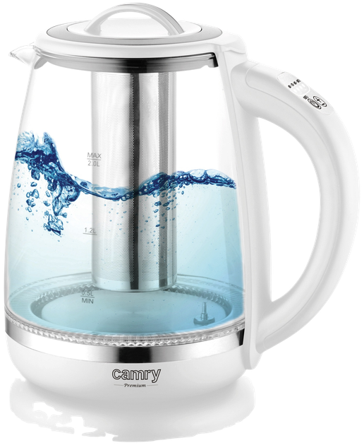 Ciesz się idealnie zaparzoną herbatą lub kawą dzięki Camry CR 1290 Biały. Ten nowoczesny szklany czajnik posiada wbudowany zaparzacz.