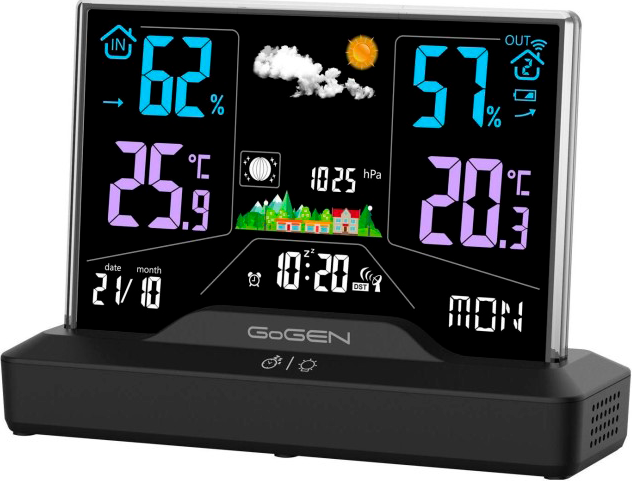 Stacja meteo GoGEN GOG-ME2000 charakteryzuje się kompaktowymi wymiarami 155 x 115 x 50 mm i niewielką wagą 300 g, co ułatwia jej umieszczenie na biurku, półce czy stoliku nocnym. Podświetlany ekran umożliwia komfortowy odczyt danych niezależnie od pory dnia czy warunków oświetleniowych. Jednostka główna jest zasilana z sieci elektrycznej za pomocą dołączonego zasilacza, natomiast bezprzewodowy czujnik zewnętrzny wymaga dwóch baterii AAA, co zapewnia elastyczność w jego rozmieszczeniu i stabilne działanie.