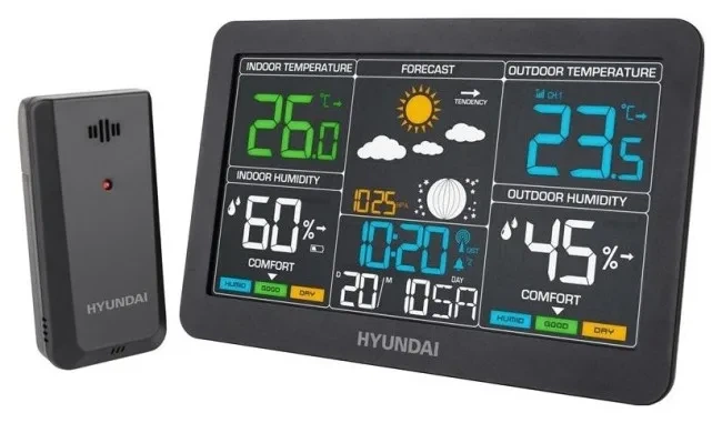 Odkryj pełen zakres informacji o warunkach atmosferycznych dzięki stacji meteo Hyundai HY-4480, utrzymanej w czarnym kolorze. Urządzenie dostarcza szczegółowych danych o pogodzie i klimacie, zarówno z wnętrza, jak i z zewnątrz budynku. Prezentuje animowane prognozy, dokładne pomiary temperatury oraz wilgotności, a także cykle Księżyca. Dodatkowo, wbudowany budzik i kalendarz czynią stację Hyundai HY-4480 funkcjonalnym dodatkiem do każdego wnętrza.