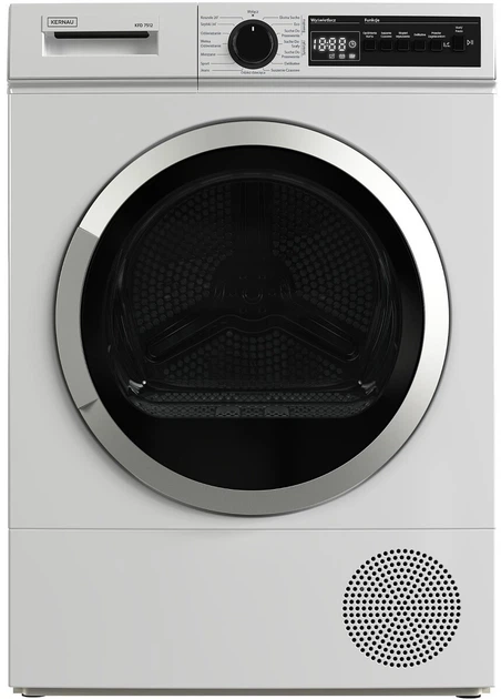 Suszarka Kernau KFD 7512 to nowoczesna suszarka z pompą ciepła o pojemności 7 kg, która łączy w sobie energooszczędność klasy E z codzienną wygodą. Pracuje z mocą 1 kW, charakteryzuje się 82% wydajnością kondensacji i poziomem hałasu 64 dB, co czyni ją stosunkowo cichą. Urządzenie oferuje 15 programów, w tym pranie bawełny, syntetyków, tkanin delikatnych, jeansu, odzieży sportowej, programy odświeżające i szybkie cykle. Posiada funkcję rewersji obrotów bębna, czujnik wilgotności, zabezpieczenie przed zagnieceniami, opóźniony start, a także system odprowadzania skroplin z możliwością podłączenia do kanalizacji. Drzwi otwierają się po prawej stronie, wyświetlacz zapewnia wygodne sterowanie, a system bezpieczeństwa obejmuje blokadę rodzicielską, alarm pełnego zbiornika oraz wskaźniki czyszczenia filtra i wymiennika ciepła. To praktyczna, funkcjonalna i niezawodna suszarka do codziennego użytku w domu.