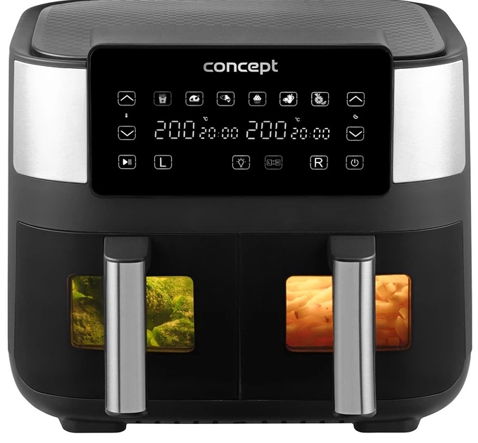 Мультипіч Concept FR8000 — це потужний та універсальний пристрій для здорового приготування страв без додавання жиру, оснащений двома металевими кошиками по 4 л з антипригарним покриттям, що дозволяє готувати дві різні страви одночасно. Загальний об’єм 8 л робить її ідеальною для сімейного використання, а оглядові віконця в кошиках та внутрішнє підсвічування дають змогу контролювати процес приготування без відкривання. Сенсорне цифрове керування пропонує 6 автоматичних програм та ручний режим, температуру можна регулювати в діапазоні 40–200 °C, а спеціальна програма сушіння працює при 40 °C з таймером до 24 годин. Мультипіч оснащена захистом від перегріву, протиковзкими ніжками, двома сталевими піддонами та потужністю 2850 Вт, що забезпечує швидке та рівномірне приготування. Пристрій важить 6.8 кг і має компактні розміри 31.2 × 36.5 × 36.5 см, що робить FR8000 практичним, містким і надзвичайно функціональним помічником на кухні.