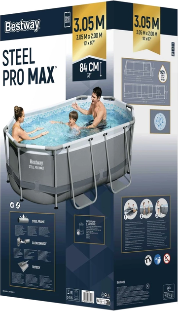 Конструкція басейну виготовлена з надміцного тришарового ПВХ із внутрішнім армуванням із нейлонової сітки. Покриття стійке до проколів, а декоративне оздоблення у вигляді мозаїки надає воді приємного вигляду. Basen легко збирається, а наявність усіх необхідних компонентів у комплекті гарантує зручність з першого використання.