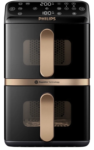 Philips Series 4000 Ovi Stacked Dual Basket NA462/70 to innowacyjna pionowa frytkownica powietrzna z dwoma oddzielnymi, 5-litrowymi koszami, umieszczonymi jeden nad drugim, umożliwiająca jednoczesne smażenie dwóch potraw, oszczędzając do 45% miejsca na blacie kuchennym. Całkowita pojemność 10 litrów pozwala na łatwe przyrządzanie dużych porcji – od 1.4 kg frytek po całego kurczaka o wadze 1.2 kg w każdym koszu. Technologia RapidAir zapewnia intensywną cyrkulację gorącego powietrza, co pozwala uzyskać chrupiącą skórkę i delikatny środek bez dodatku oleju, a funkcja automatycznej synchronizacji czasu gwarantuje, że oba dania będą gotowe jednocześnie. Okienko kontrolne i wskaźnik „Shake Time” ułatwiają monitorowanie procesu smażenia bez otwierania koszy. Urządzenie oferuje 13 trybów pracy i 6 programów automatycznych, a nowa, niezawierająca PFAS powłoka nieprzywierająca jest trwała, odporna na zarysowania i łatwa w czyszczeniu. Wszystkie wyjmowane części można myć w zmywarce, a sam piekarnik wielofunkcyjny działa do 40% szybciej i zużywa do 65% mniej energii niż piekarnik konwencjonalny. Obsługa aplikacji Philips HomeID zapewnia dostęp do setek przepisów i spersonalizowanych ustawień, dzięki czemu gotowanie jest jeszcze wygodniejsze.