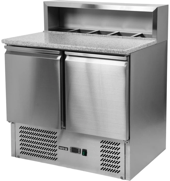 Стіл холодильний YATO YG-05275 — це професійне гастрономічне обладнання для приготування та зберігання продуктів, особливо піци та салатів, яке має двоє дверей і надставку з контейнерами GN 1/6 для зручної організації інгредієнтів. Робоча поверхня виконана з граніту, що забезпечує гігієнічність і довговічність, корпус виготовлений із нержавіючої сталі SS201, стійкої до корозії. Це практичний і надійний холодильний стіл, який забезпечує ефективну роботу кухні та збереження свіжості продуктів.