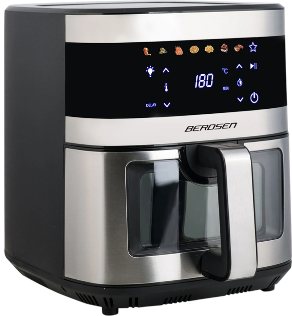 Мультипіч Berdsen BD‑656 Срібляста — це містка та сучасна аерофритюрниця з об’ємом 9.1 л, яка дозволяє готувати здоровіші страви для всієї родини, використовуючи на 90% менше жиру без втрати смаку та хрусткості. Потужність 1700 Вт забезпечує швидке нагрівання та рівномірне приготування, а 7 автоматичних програм і сенсорний екран роблять керування простим і інтуїтивним. Кошик із віконцем та LED‑підсвічуванням дозволяє контролювати процес без відкривання, а функції відкладеного старту та нагадування про перевертання страви додають зручності у щоденному використанні. Мультипіч працює в діапазоні температур 40–200°C, має таймер на 1–60 хвилин, теплоізоляційний корпус, елементи з нержавіючої сталі, захист від перегріву, автоматичне вимкнення та ручку з холодним дотиком. Решітка з нержавіючої сталі з PTFE‑покриттям не потребує паперу для випічки, що робить приготування ще простішим. Це універсальний кухонний помічник, який поєднує великий об’єм, потужність і комфорт у використанні.