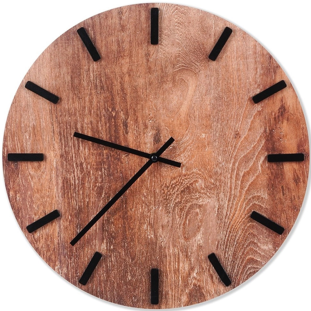 - SOLIDNY - Zegar wykonany z wysokiej jakości płyty MDF, która swoim wyglądem przypomina drewno. Tarcza jest w brązowym kolorze, a wskazówki oraz kreski oznaczające godzinę są w czarnym kolorze.