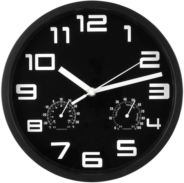 - НАСТІННИЙ – Привабливий круглий настінний годинник діаметром 25 см. Годинник також оснащений термометром та гігрометром. Оригінальна прикраса для вітальні або офісу. Товщина годинника – 4 см. Годинник живиться від однієї батарейки типу АА 1.5 В (не входить до комплекту).