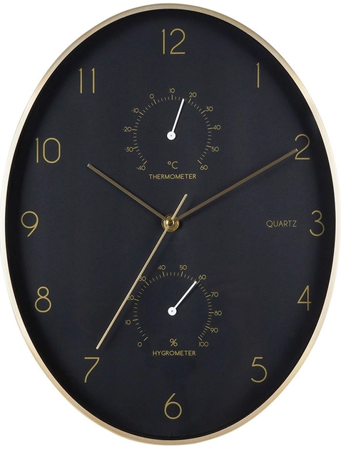 Овальний настінний годинник з термометром та гігрометром. Має класичний дизайн. Він чудово виглядатиме в будь-якому інтер'єрі. Годинник стане чудовим подарунком, наприклад, на новосілля чи день народження. Класичний стиль годинника доповнить будь-який дизайн інтер'єру. Оформлений у модному поєднанні золотого та чорного кольорів, він дозволяє легко зчитувати час, температуру повітря та вологість. Виготовлений відповідно до європейських стандартів.