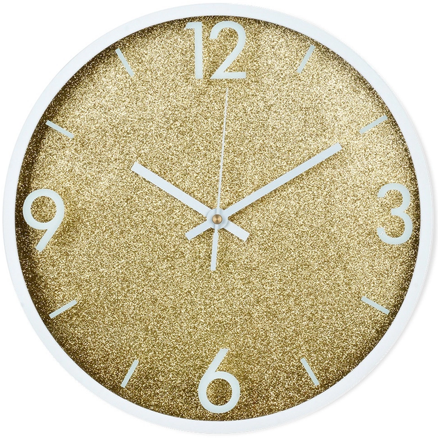 - Блискучий циферблат - Рамка годинника виготовлена з білого пластику найвищої якості. Циферблат годинника виблискує золотом. Стрілки годинника та годинникові мітки білі, створюючи елегантний контраст.