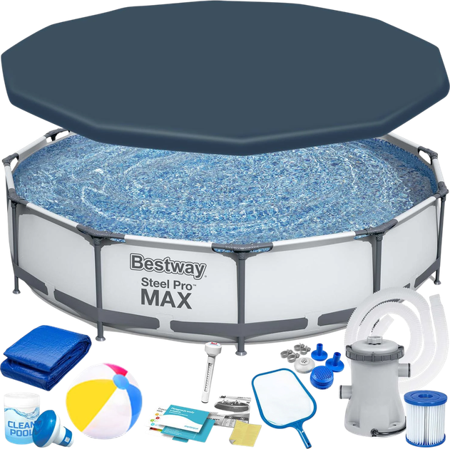 Набір 16в1 містить все необхідне для підтримки чистоти води. Фільтрувальна помпа разом з фільтром типу I сприяє регулярній циркуляції, а мультитаблетки, дозатор хімікатів і термометр полегшують поточний догляд. Кришка для басейну захищає воду від забруднення, обмежує її охолодження та захищає басейн від неконтрольованого доступу дітей. Килимок під басейн захищає дно, ізолює чашу від підлоги та обмежує потрапляння піску.
