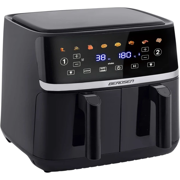 Мультипіч Berdsen BD‑657 — це двокамерна безжирова фритюрниця з загальним об’ємом 10.2 л, поділеним на дві незалежні камери по 5.1 л кожна, що дозволяє одночасно готувати різні страви без змішування ароматів. Пристрій оснащений потужністю 1700 Вт, електронним керуванням і сенсорним дисплеєм, який забезпечує зручний вибір режимів та параметрів приготування. Температура регулюється в діапазоні від 40 до 200 °C з кроком 5 °C, а таймер дозволяє встановлювати час роботи від 1 до 60 хвилин, що робить прилад універсальним для смаження, запікання, підігріву та сушіння продуктів. Вона має 8 автоматичних програм, включно з режимами для картоплі фрі, курки, м’яса, риби, піци та морепродуктів, що спрощує процес приготування навіть для недосвідчених користувачів. Корпус виконаний із термоізоляційного матеріалу з елементами з нержавіючої сталі, що забезпечує безпечну експлуатацію та довговічність пристрою. Модель підтримує функцію попереднього нагрівання, а також має антипригарні кошики, які легко очищуються після використання. Завдяки великому об’єму, двом окремим нагрівальним елементам і незалежному керуванню камерами вона підходить для сімейного приготування та дозволяє готувати повноцінні страви швидше та здоровіше, використовуючи мінімальну кількість олії.