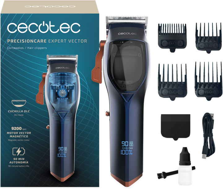 Машинка для підстригання волосся Cecotec PrecisionCare Expert Vector — це професійний інструмент для точного та комфортного стайлінгу, створений для тих, хто цінує потужність, надійність і максимальний контроль. Оснащена магнітним векторним двигуном зі швидкістю 9200 об/хв, вона забезпечує стабільну роботу та легке зрізання навіть густого й жорсткого волосся. Лезо з нержавіючої сталі DLC та кераміки гарантує довговічність, високу гостроту та плавність руху, зменшуючи ризик подразнення шкіри. Інтелектуальний дисплей показує залишок заряду та кількість обертів, дозволяючи планувати стрижку без перерв. Акумулятор забезпечує до 90 хвилин безперервної роботи, що робить машинку зручною як для домашнього використання, так і для подорожей. У комплект входять 4 насадки (3/6/9/13 мм), а також регулювальний важіль, який дозволяє точно налаштовувати довжину зрізу та створювати індивідуальні стилі. Функція індикатора технічного обслуговування повідомляє про необхідність змащення лез або низький заряд батареї. Заряджання через USB‑C забезпечує швидкість і універсальність, а комплектна щітка та мастило допомагають підтримувати леза в ідеальному стані. Ергономічний дизайн гарантує зручний хват і мінімальну втому під час тривалих сеансів стрижки, забезпечуючи точність і комфорт у кожному русі.