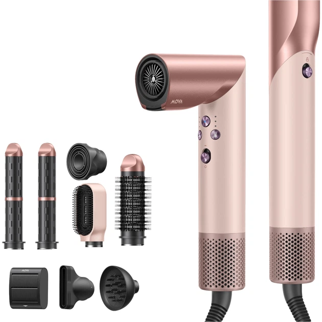 Фен Mova Master 10 Рожевий — це потужний фен преміум‑класу з технологією Coanda, який поєднує функції фена, стайлера та доглядового інструмента. Оснащений мотором 1600 Вт, працює тихо (≈59 дБ), має 3 швидкості повітря та 4 температурні режими від 37 до 80 °C з NTC‑контролем, що вимірює температуру 1000 разів за секунду для захисту волосся. Підтримує негативну іонізацію для зняття статичності та додання блиску. Пристрій автоматично розпізнає насадки та підбирає оптимальні параметри. Має ергономічний дизайн, обертання шнура на 360°, швидкий нагрів і підходить для будь‑якого типу волосся, забезпечуючи професійний результат у домашніх умовах.