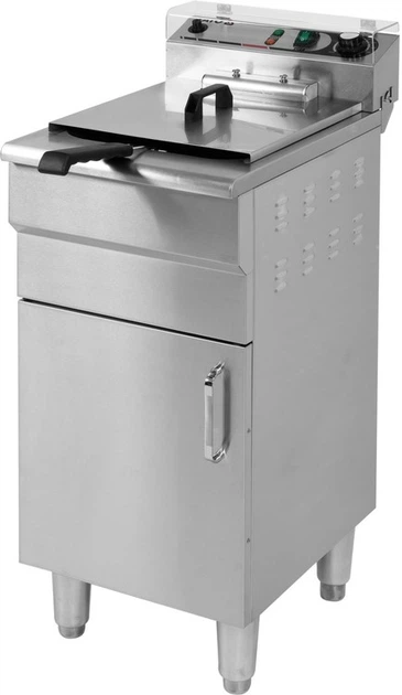 Нагрівальний елемент потужністю 5.0 кВт контролюється потенціометром, розташованим на панелі керування. Робочу температуру можна встановити в діапазоні від 60 до 200°C. Бризкозахищений вимикач дозволяє вимикати пристрій, не від'єднуючи шнур живлення. Крім того, панель керування має захисну кришку з високоміцного полікарбонату, яка захищає панель від бризок олії під час смаження. Це значно полегшує утримання фритюрниці в чистоті. Знімний нагрівальний елемент можна підвісити на спеціальні тримачі, що дозволить олії, що капає, стікати назад у бак. Фритюрниця має додаткову функцію безпеки, яка автоматично вимикає нагрівальний елемент, коли його виймають з резервуара. Ця додаткова функція безпеки захищає її від перегріву за температури вище 260℃.