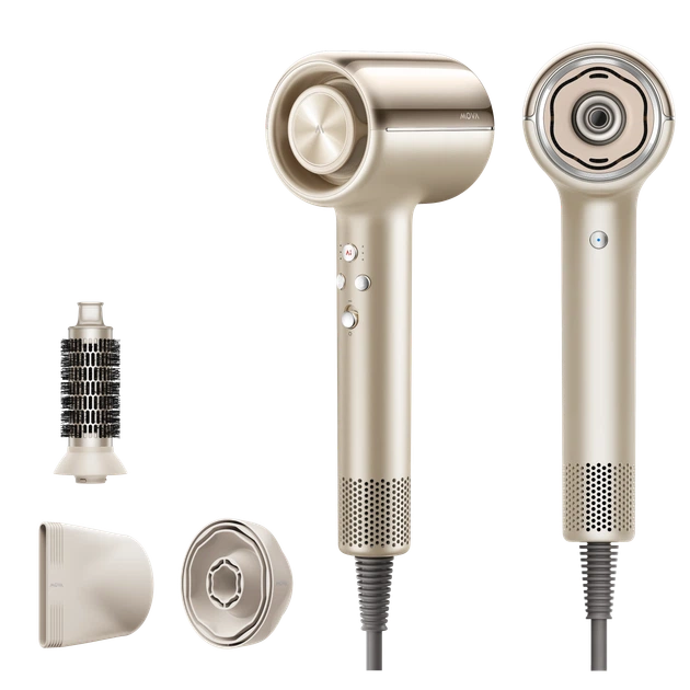 Фен Mova Shine 20 Золотистий — це високошвидкісний фен потужністю 1800 Вт із тихою роботою близько 60 дБ, швидкістю повітря до 65 м/с та трьома режимами швидкості й чотирма температурними режимами для делікатної та ефективної сушки. Оснащений NTC‑контролем температури для захисту від перегріву та функцією холодного повітря для фіксації укладки. Має легкий ергономічний корпус. Фен забезпечує професійний результат у домашніх умовах і підходить для всіх типів волосся.