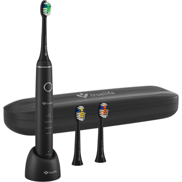 Електрична зубна щітка TrueLife SonicBrush Compact у чорному кольорі — це ефективне та стильне рішення для щоденного догляду за зубами, оснащене вдосконаленою звуковою технологією SonicTrue, яка забезпечує до 70 000 рухів за хвилину для максимального видалення нальоту. Модель пропонує 4 режими роботи — очищення, догляд для чутливих зубів, відбілювання та масаж ясен, що дозволяє підібрати оптимальний режим для будь-яких потреб. Завдяки компактному розміру та дорожньому футляру щітку зручно брати із собою, а потужний акумулятор забезпечує до 30 днів роботи без підзарядки. Ніжні вібрації дбайливо впливають на емаль, а завдяки ефекту мікрокавітації паста та вода проникають у міжзубні проміжки для глибшого очищення. У комплект входять три змінні насадки (чутлива, стандартна, відбілююча), зарядна станція та футляр, що робить SonicBrush Compact повноцінним набором для якісної гігієни ротової порожнини вдома та в подорожах.