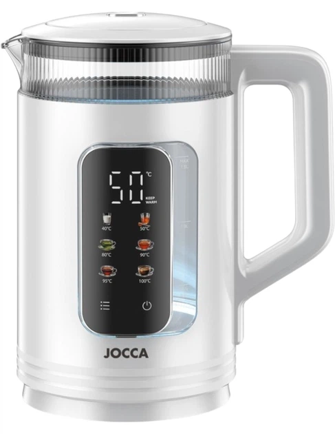 Електрочайник Jocca 2894 — це скляний чайник об’ємом 1.5 л і потужністю 1500 Вт, оснащений кольоровим сенсорним екраном для керування та RGB‑підсвіткою, яка змінюється залежно від стану води. Він має контролер STRIX, що забезпечує захист від перегріву, автоматичне вимкнення та безпечну роботу навіть за відсутності води. Корпус виконаний зі стійкого до високих температур скла з кришкою з PP‑пластику, а індикатор рівня води полегшує щоденне використання. Чайник поєднує сучасний дизайн, швидке кип’ятіння та підвищену безпеку, підходячи для дому та офісу.