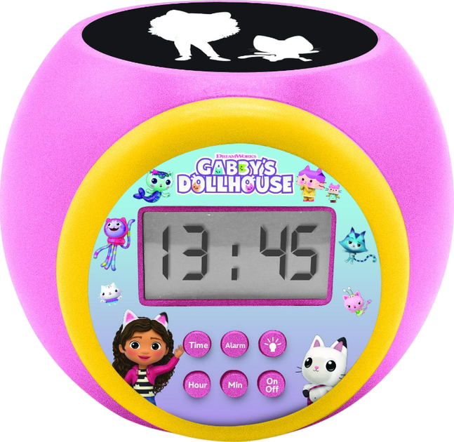 Чарівний будильник з мотивом Ґаббі – ідеальний аксесуар для дитячої кімнати. Він поєднує в собі функції годинника та проектора, який створює на стелі барвисту, затишну атмосферу перед сном. Завдяки казковому мотиву пристрій особливо сподобається шанувальникам популярної серії та зробить засинання та ранкове прокидання приємнішими.