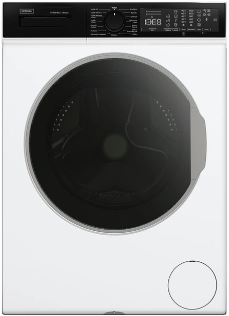 Пральна машина Kernau KFWM 8423.1 I Steam — це біла вузька модель глибиною 45.7 см із завантаженням 8 кг та максимальною швидкістю віджиму 1200 об/хв, що забезпечує клас енергоефективності A та клас віджиму B. Вона пропонує 15 програм, серед яких Швидкі 12’, 29’, 44’ і 59’, Сорочки/Штори, Полоскання, Віджим + Злив, Гігієнічна, Еко 40–60, Бавовна, Синтетика, Видалення плям, Кольори/Постільна білизна, Вовна/Ручне прання та Ковдри. Машина підтримує автоматичне зважування, регулювання температури та швидкості віджиму, має відкладений старт, систему контролю піни та функцію пари, а також додаткові можливості: скорочення часу прання, додаткове полоскання, вибір типу плями, ступеня забруднення, легке прасування, очищення барабана та Старт/Пауза. Рівень шуму під час віджиму становить 75 дБ, залишкова вологість — 53.4 %, витрата води — 42 л за цикл, а тривалість еко‑програми — 218 хвилин. Керування сенсорне з ручкою, є дисплей, додатково передбачено індикатор часу, що залишився, великі двері, корпус Boomerang та шкалу споживання води й енергії. Машина оснащена індукційним двигуном і технологією Еко‑Логіка.