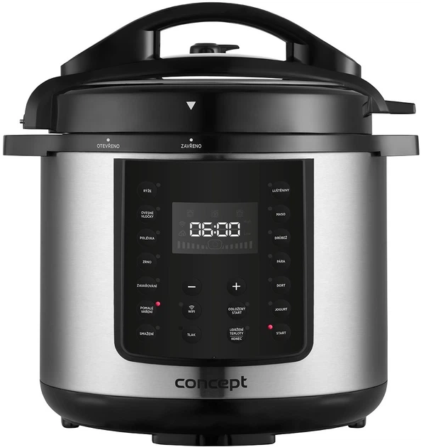 Мультиварка Concept CK8001 — це багатофункціональний кухонний помічник із підтримкою мобільного додатка Concept Home, який дозволяє керувати приготуванням дистанційно через Wi‑Fi 2.4 ГГц і доступний чеською, словацькою, польською та англійською мовами. У пристрої передбачено 13 попередньо встановлених програм, включно з рисом, супами, м’ясом, бобовими, приготуванням на пару, тортами та йогуртом, а в додатку доступні ще 24 готові програми, що значно розширює можливості приготування. Мультиварка оснащена антипригарною чашею об’ємом 5.6 л, чітким цифровим дисплеєм, функціями підтримки тепла, відкладеного старту (0.5–24 год) та регулюванням часу від 1 хвилини до 24 годин. Вона підтримує режими високого та низького тиску, має захист від перегріву, а знімний контейнер можна мити в посудомийній машині. Працює модель від мережі 220–240 В і має вхідну потужність 1000 Вт, забезпечуючи зручність, безпеку та широкий спектр кулінарних можливостей.