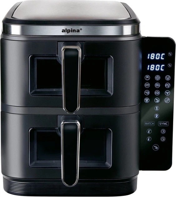 Мультипіч Alpina XXL у чорному кольорі — це потужна двокамерна аерофритюрниця з об’ємом 11 літрів, створена для великих сімей та тих, хто хоче готувати більше й швидше. Дві незалежні камери по 5.5 л дозволяють одночасно готувати різні страви без змішування ароматів, а функції SYNC та MATCH синхронізують час приготування або копіюють налаштування між кошиками. Потужність 2800 Вт забезпечує надзвичайно швидкий нагрів і рівномірну циркуляцію гарячого повітря, завдяки чому страви виходять хрусткими зовні та соковитими всередині без зайвого жиру. Сенсорна LED‑панель з 12 автоматичними програмами робить керування інтуїтивним, а діапазон температур 60–200°C та таймер до 60 хвилин дають повний контроль над процесом. Антипригарні кошики легко очищуються, а міцна конструкція та автоматичне вимкнення гарантують безпечне використання. Alpina XXL — це універсальний кухонний помічник, який дозволяє готувати більше, швидше та корисніше щодня.