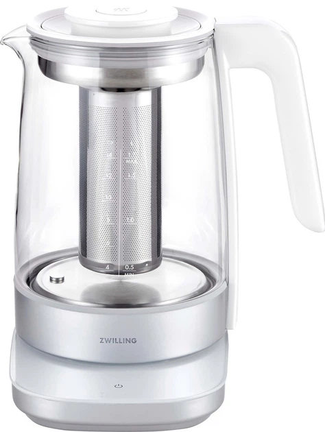 Elektryczny czajnik Zwilling Enfinigy 53102-500-0 będzie doskonałym pomocnikiem w urozmaicaniu i ułatwianiu codziennej rutyny. Jego elementy grzewcze wykonane są z wysokiej jakości stali nierdzewnej. Posiada 10 programów i 6 poziomów temperatury (40°C, 60°C, 70°C, 80°C, 93°C, 100°C). Dzięki praktycznej funkcji utrzymywania ciepła, optymalna temperatura może być utrzymywana do 30 minut. Klapkę zaparzającą można łatwo wyjąć dzięki zintegrowanemu przyciskowi w pokrywie, a szklana powierzchnia czajnika jest łatwa do czyszczenia. Czajnik jest również wyposażony w dzióbek do łatwego nalewania i timer, który pozwala wybrać czas parzenia od 1 do 10 minut, w zależności od czasu parzenia herbaty.